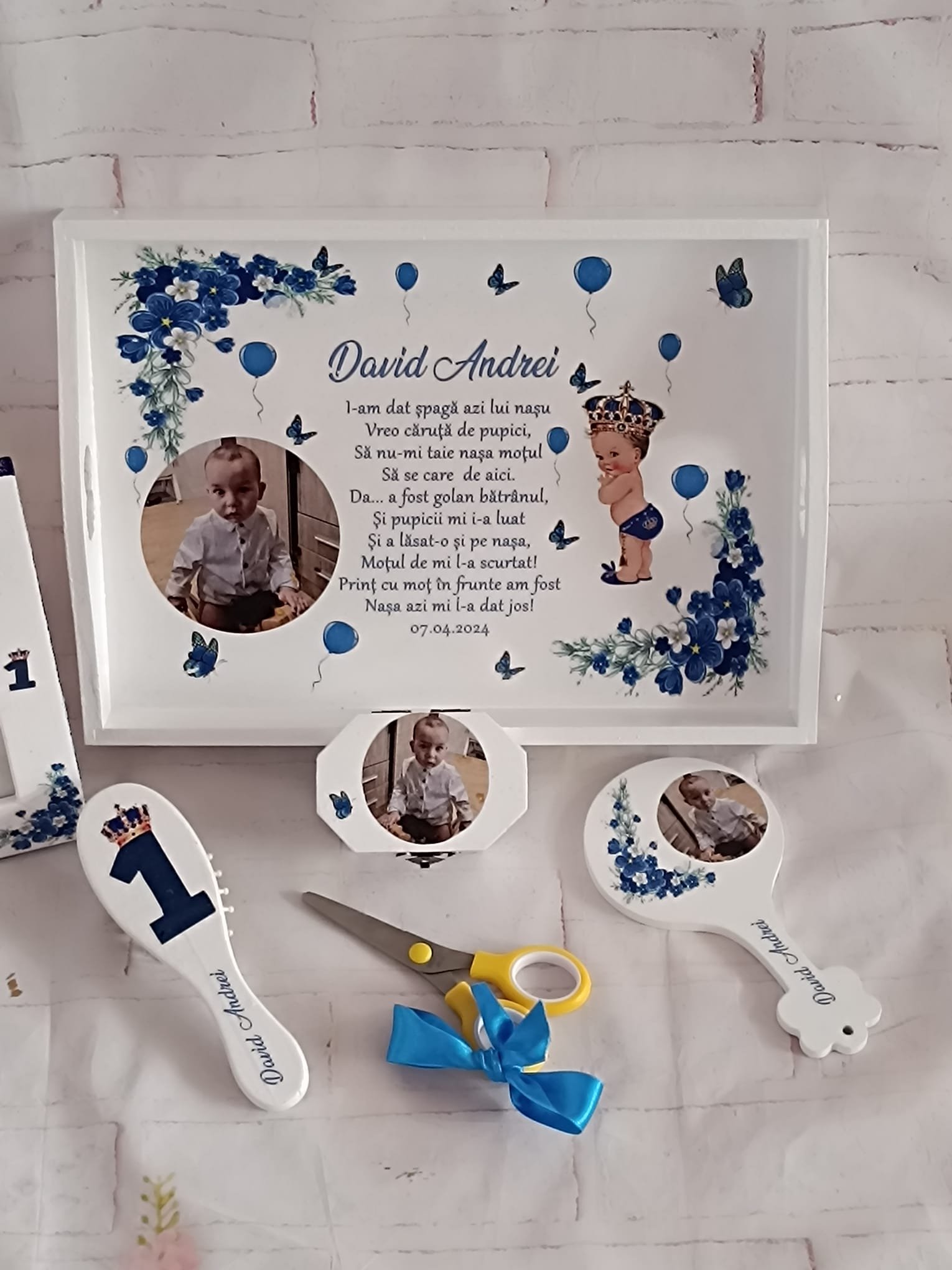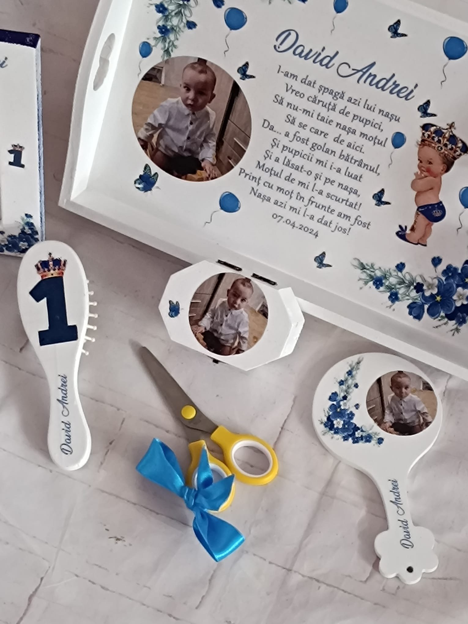 Aceste tăvițe sunt realizate cu atenție la detalii și pot fi personalizate cu numele copilului, data evenimentului sau elemente decorative specifice, devenind astfel un obiect unic și special. Ele sunt folosite pentru a așeza obiectele simbolice care vor contura viitorul copilului, transformând ceremonia într-o amintire de neuitat.