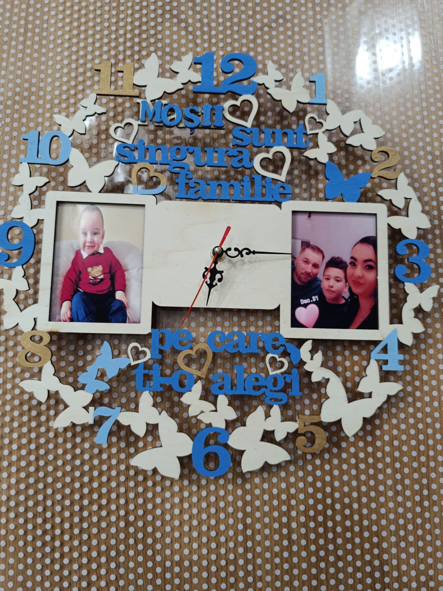 Ceas din placaj de lemn decupat laser, cu 2 rame foto, decorat cu inimioare , fluturi si mesajul: