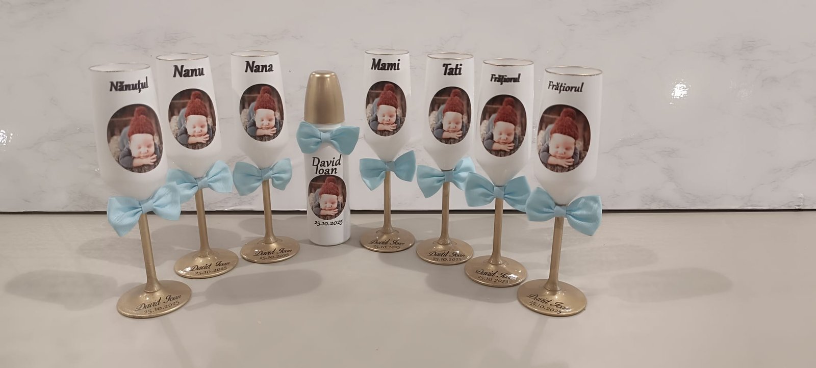 Fie că sunt decorate cu numele copilului, data botezului, simboluri delicate sau elemente florale, paharele botez adaugă un plus de rafinament mesei festive. Sunt ideale atât pentru ceremonie, cât și pentru petrecerea de după, dar și ca obiect decorativ sau cadou special.