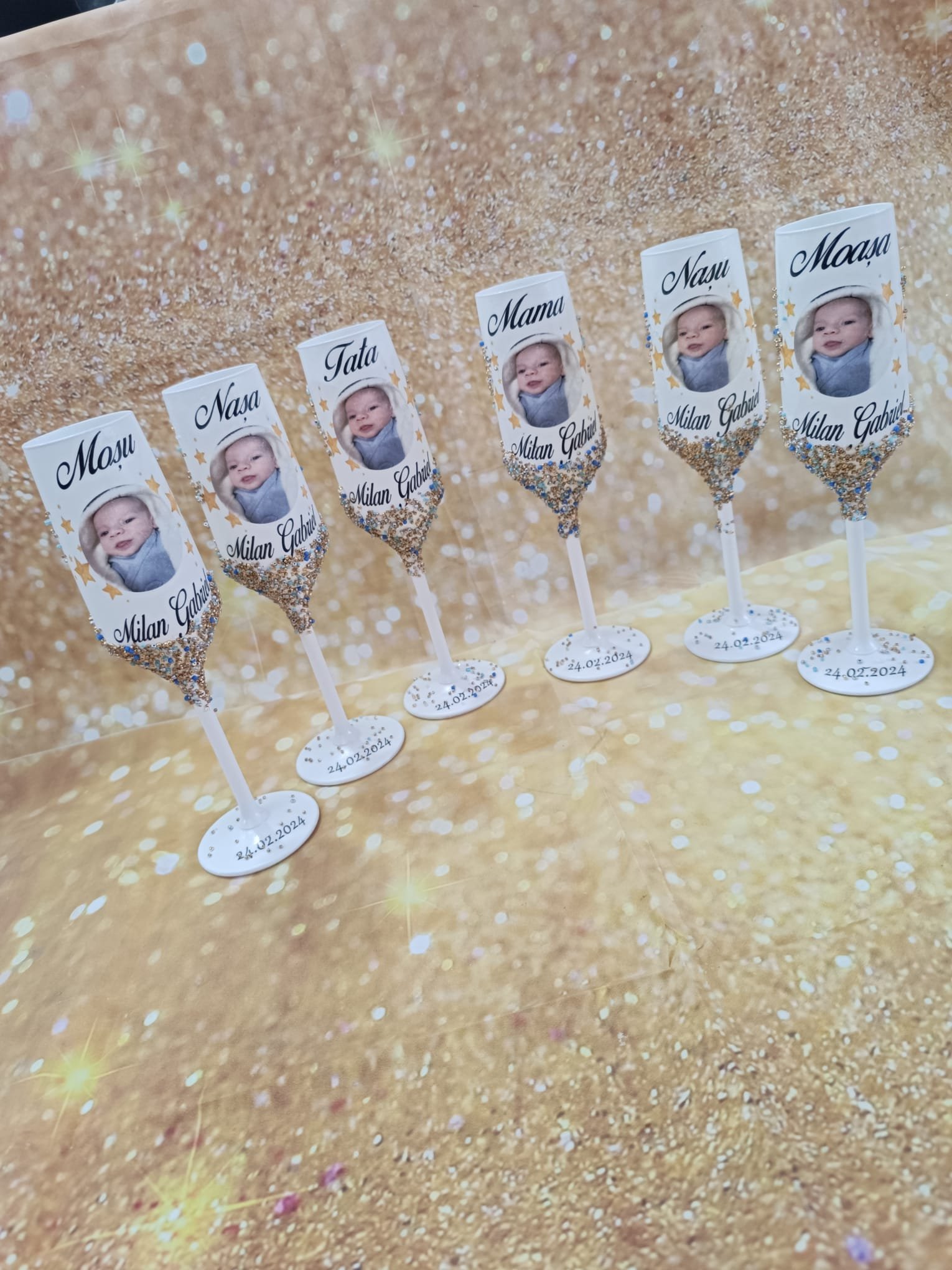 Fie că sunt decorate cu numele copilului, data botezului, simboluri delicate sau elemente florale, paharele botez adaugă un plus de rafinament mesei festive. Sunt ideale atât pentru ceremonie, cât și pentru petrecerea de după, dar și ca obiect decorativ sau cadou special.
