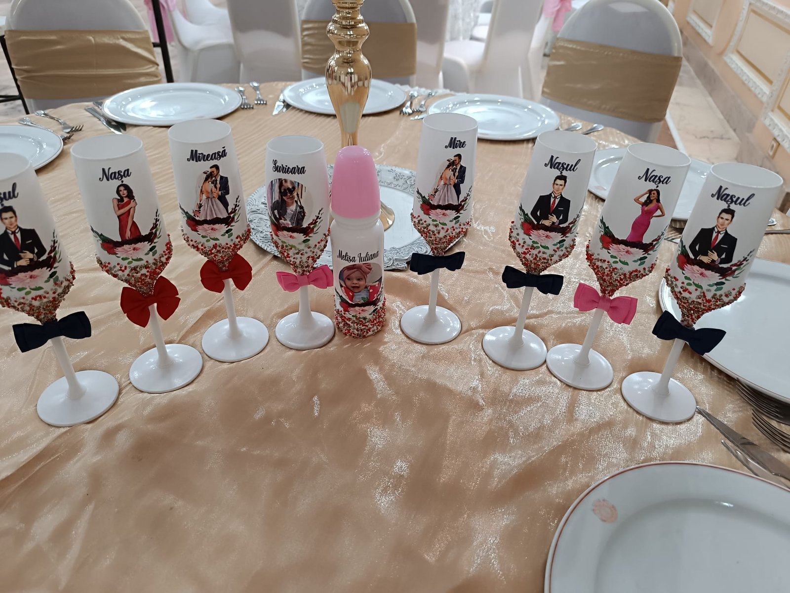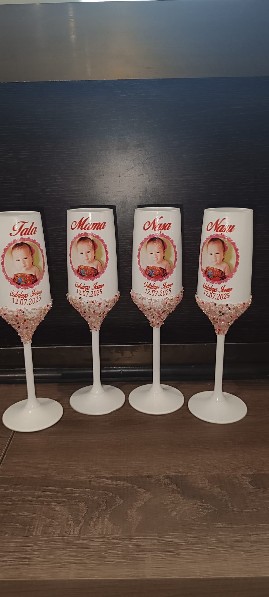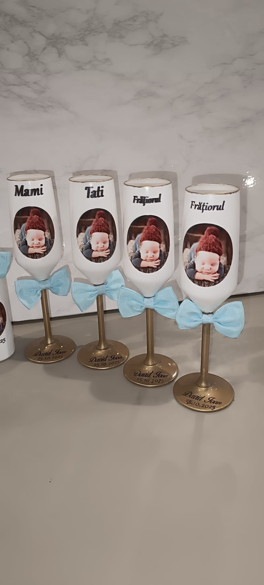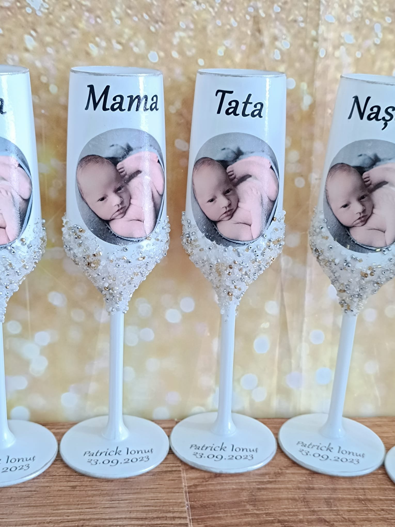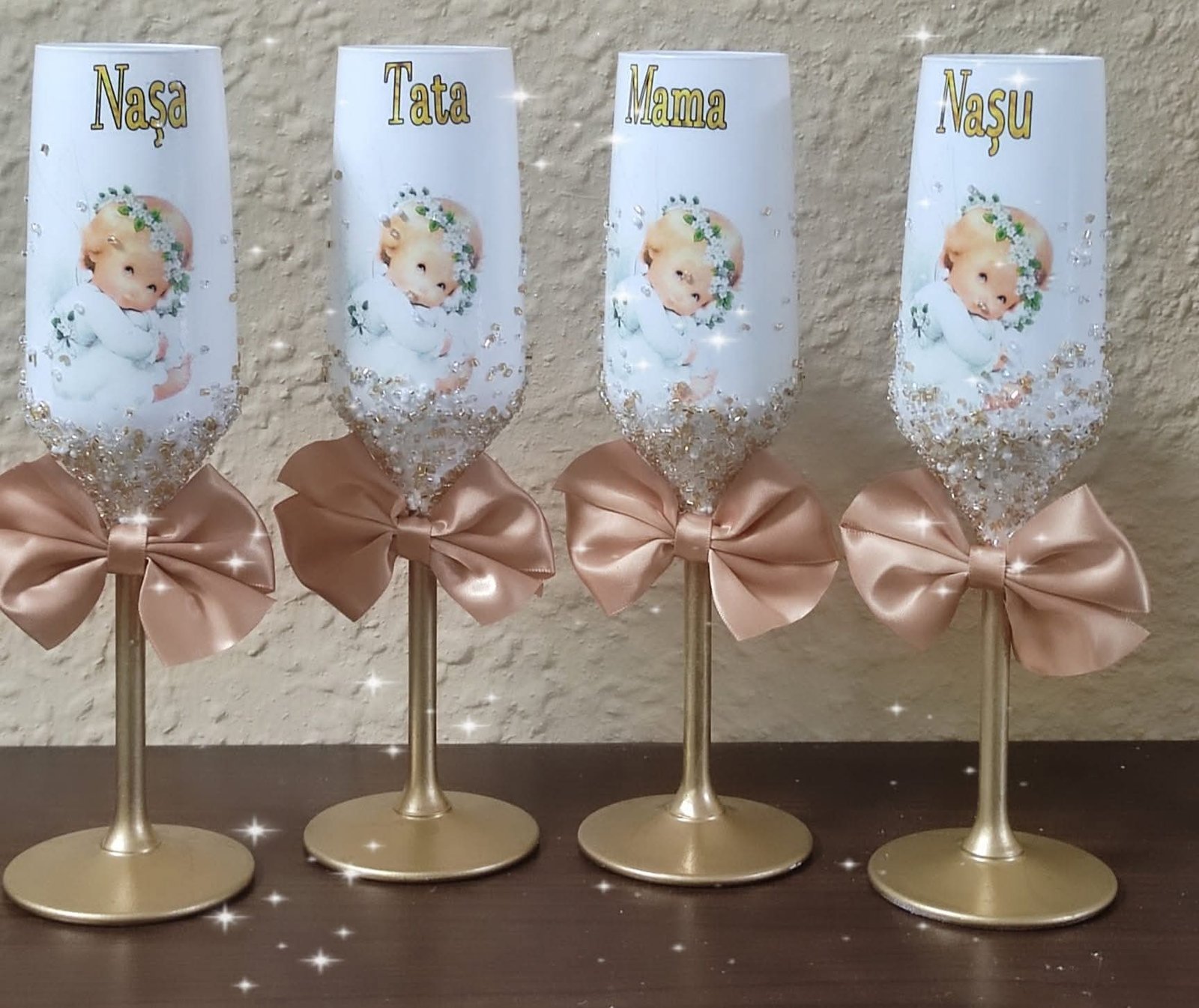 Fie că sunt decorate cu numele copilului, data botezului, simboluri delicate sau elemente florale, paharele botez adaugă un plus de rafinament mesei festive. Sunt ideale atât pentru ceremonie, cât și pentru petrecerea de după, dar și ca obiect decorativ sau cadou special.
